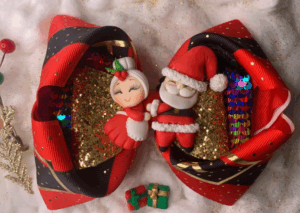 Celebrate the season with this delightful Santa and Mrs. Claus hair bow set, perfect for spreading holiday joy! These handcrafted clips feature a glittery gold base with vibrant red and black ribbons, complete with adorable sleeping clay figurines. A whimsical and festive accessory for holiday events or Christmas morning photos.